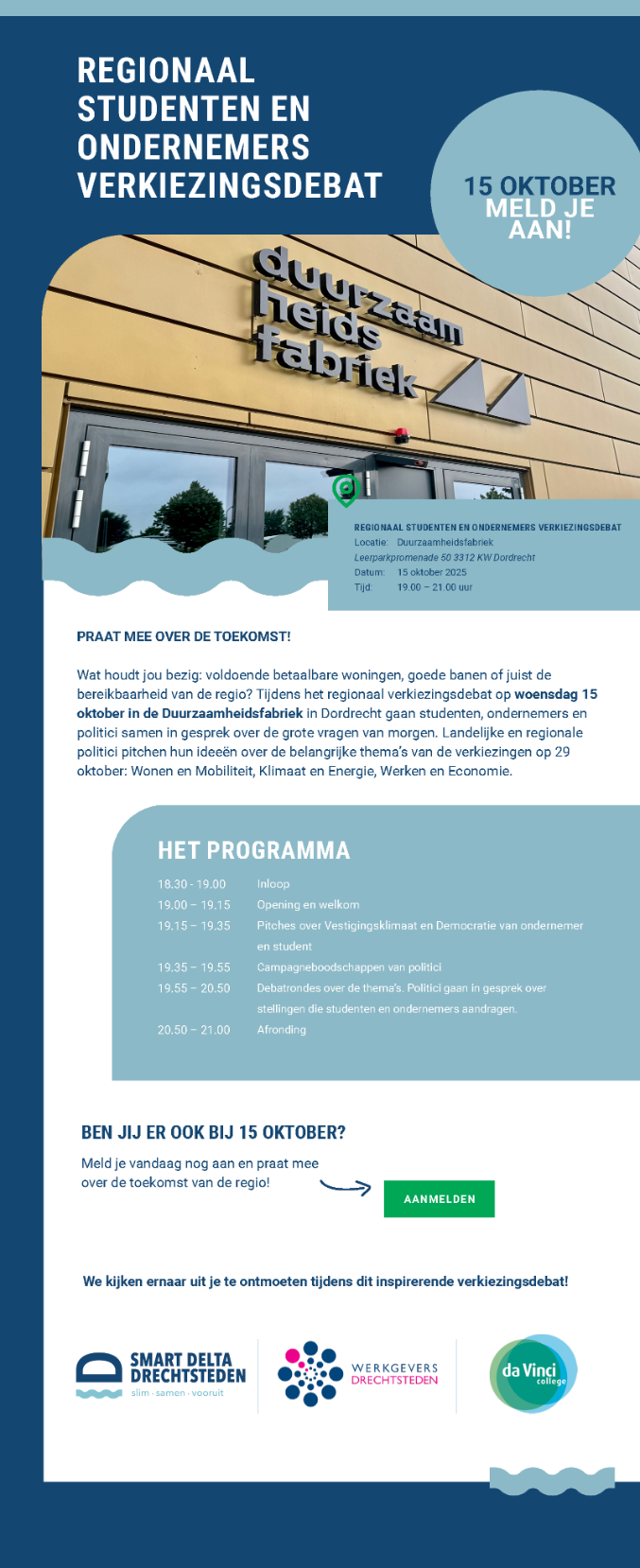 Op woensdagavond 15 oktober organiseren Smart Delta Drechtsteden en het ROC Da Vinci College een verkiezingsdebat in de Duurzaamheidsfabriek. Tijdens dit debat gaan politici, studenten en ondernemers in gesprek over thema’s die juist voor ónze regio belangrijk zijn: de maritieme maakindustrie, onderwijs, leefbaarheid en brede welvaart.